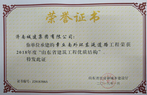 章丘南外環東延道路工程被評為2018年度“山東省建筑質量泰山杯工程”