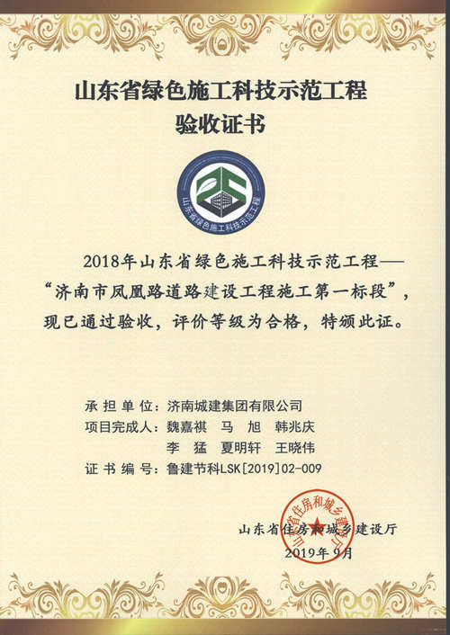 濟南市鳳歧路道路建設工程施工一標段被評為2018年山東省綠色施工科技示范工程